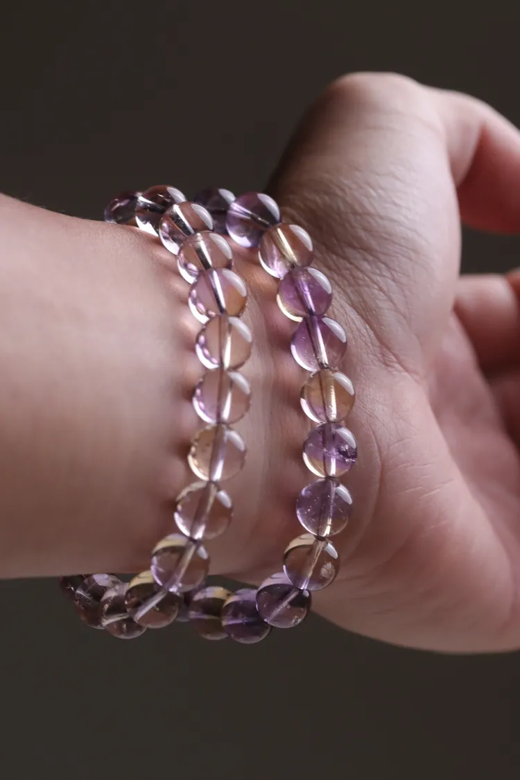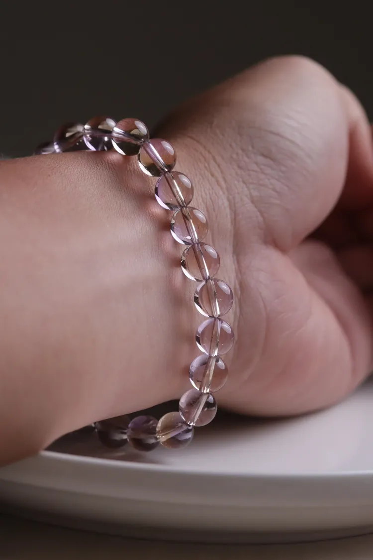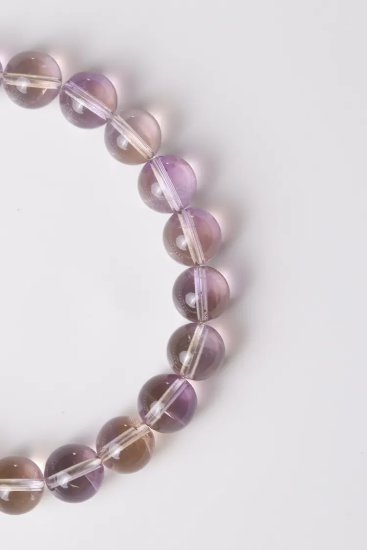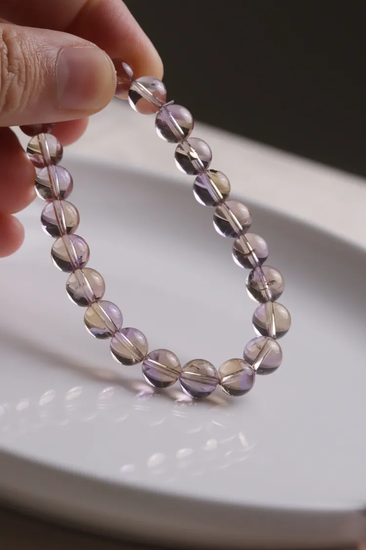 晶體很好的紫黃晶,是兩種顏色在同一顆珠子裡的紫黃,顏色會比較淡,可是還是都會有雙色。