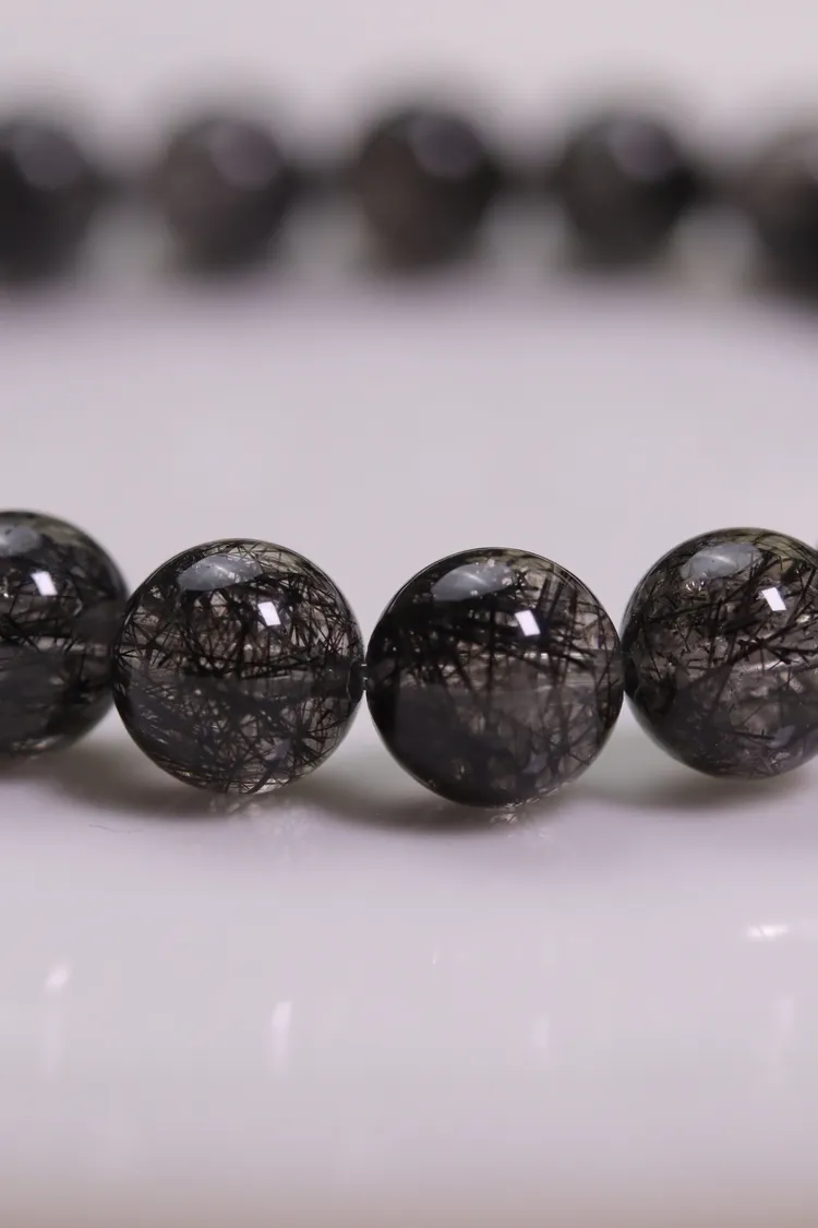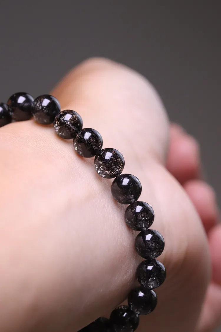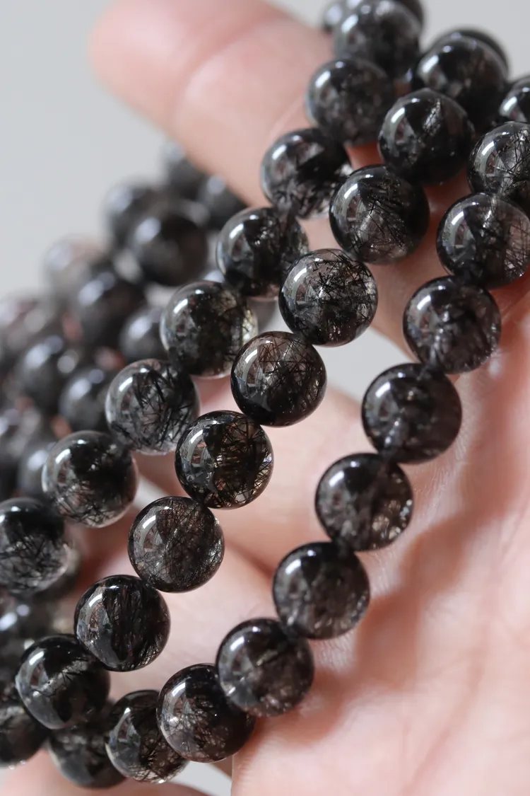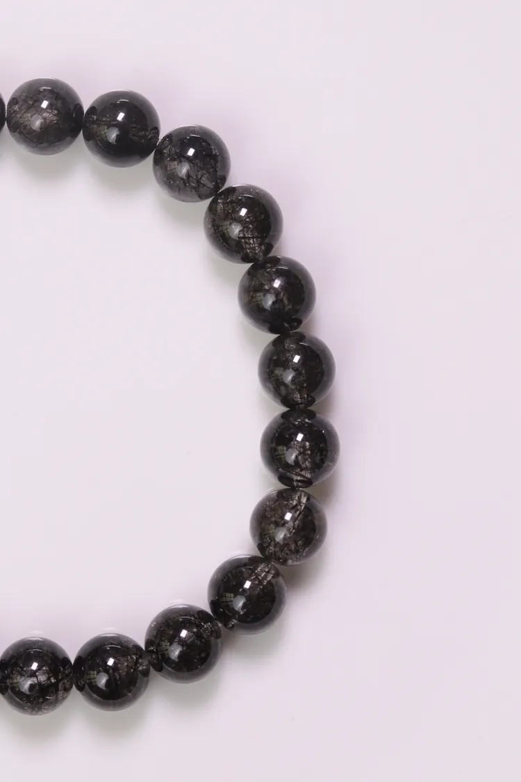 乍看是滿滿的黑色,稍微透光可以看到裡面是有透度的,是亂髮的黑髮晶,晶體表現會比順絲的好。