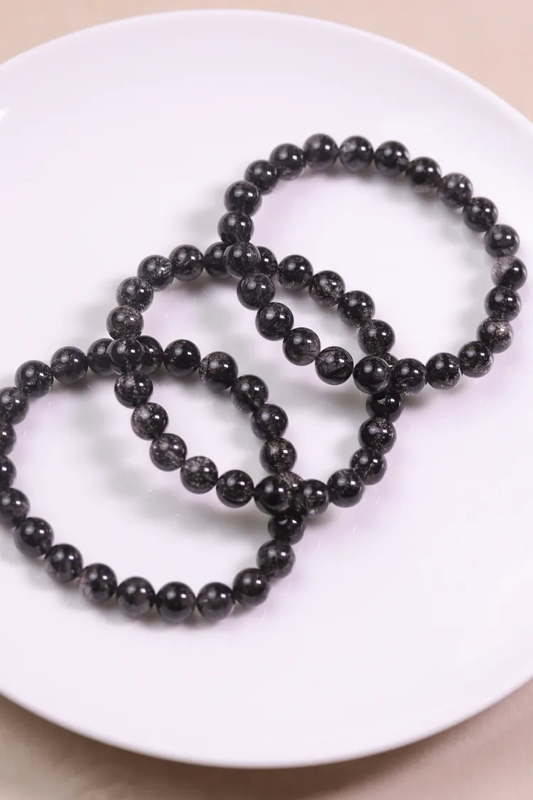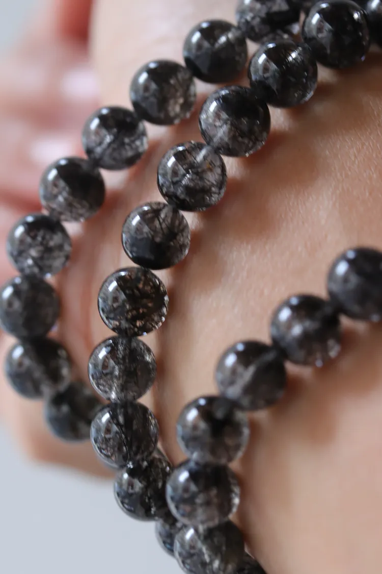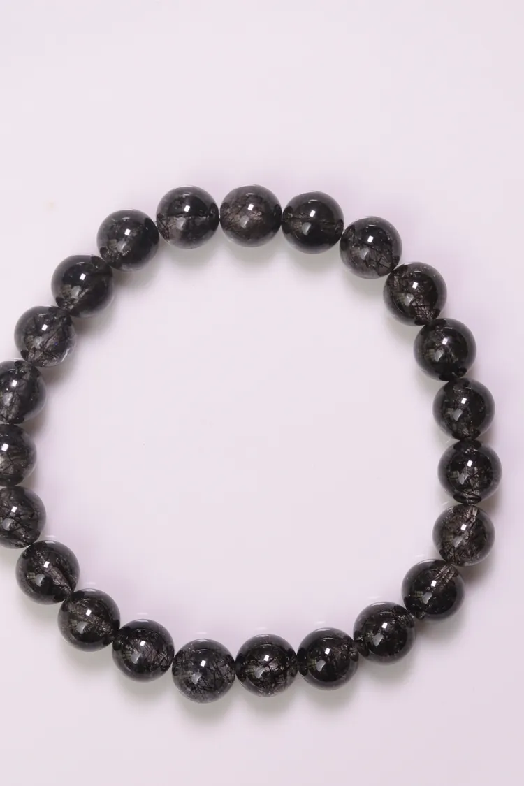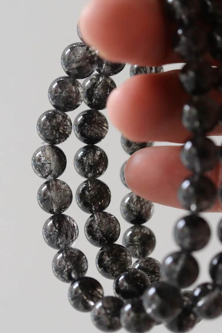乍看是滿滿的黑色,稍微透光可以看到裡面是有透度的,是亂髮的黑髮晶,晶體表現會比順絲的好。