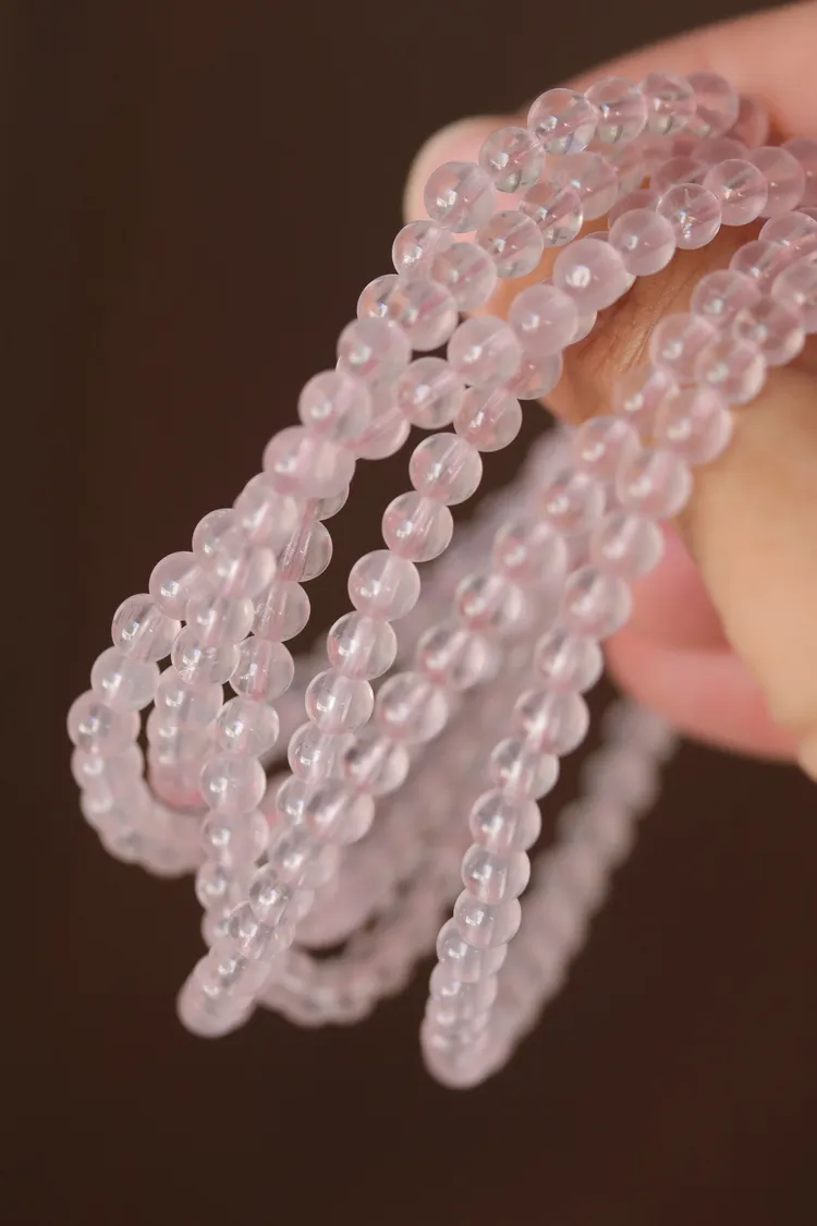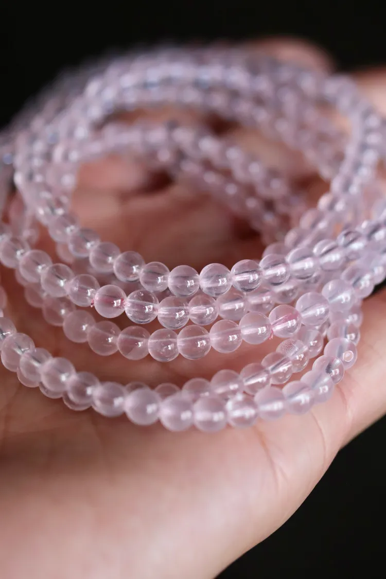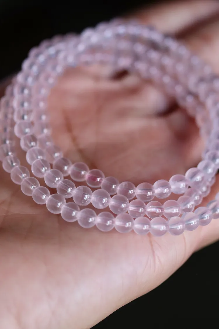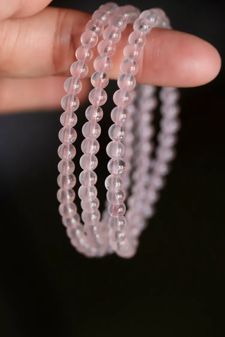 很少見的迷你尺寸粉晶,晶體很清透,串的是透明的粉色線,換成全透明線的話會變成非常淡粉,透體的粉晶通常都是要越大顆才會越顯色。