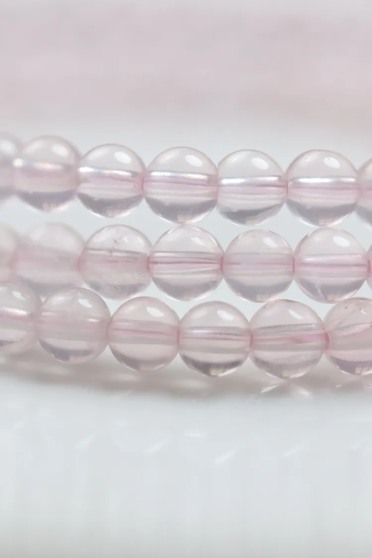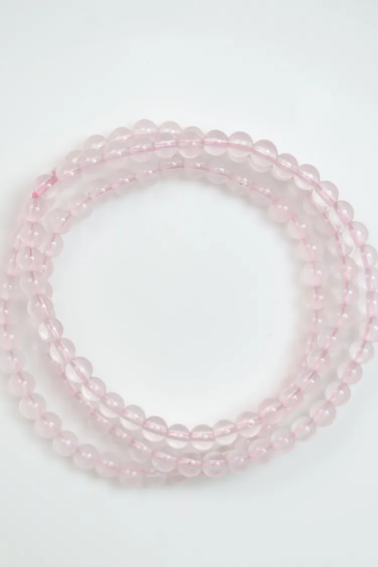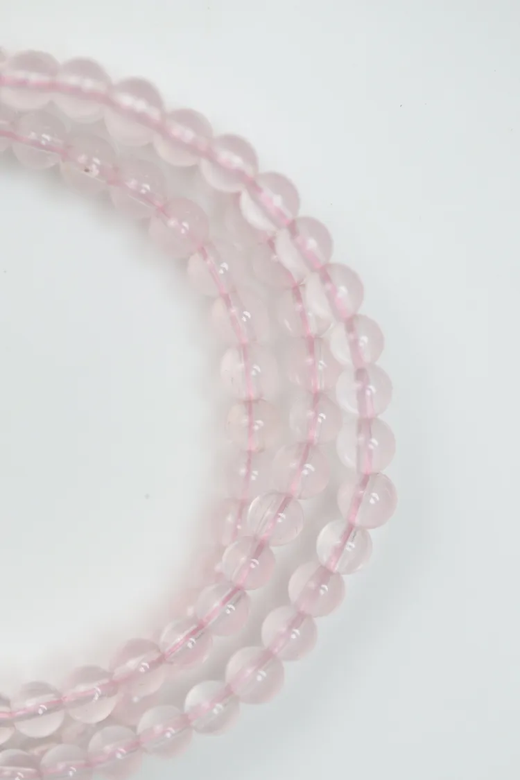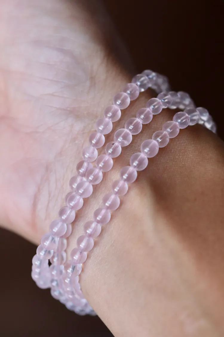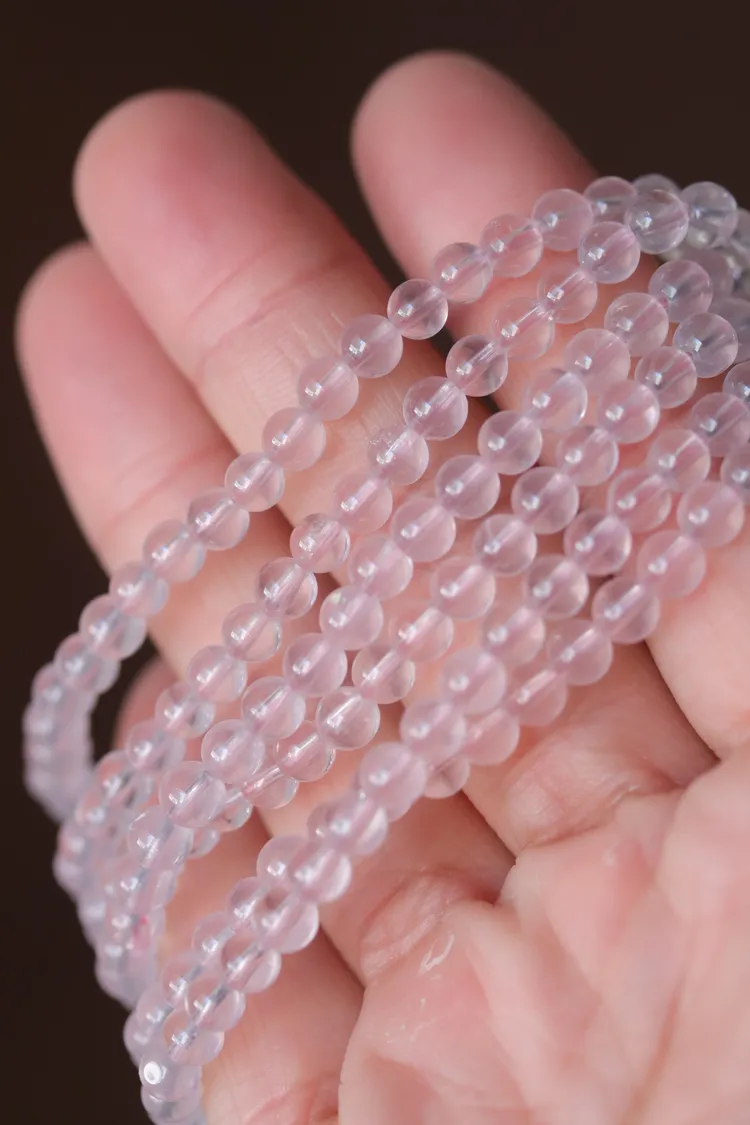 很少見的迷你尺寸粉晶,晶體很清透,串的是透明的粉色線,換成全透明線的話會變成非常淡粉,透體的粉晶通常都是要越大顆才會越顯色。